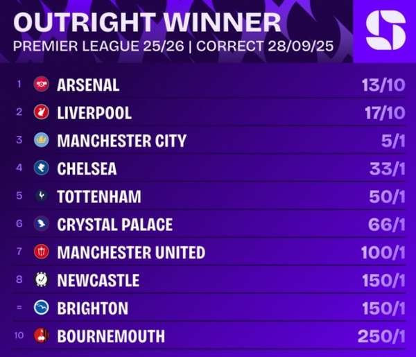 来源:360直播2025-09-29 07:12:32英超联赛冠军争夺形势出现新变化。在阿森纳完成对纽卡斯尔联的2-1逆转绝杀后,最新夺冠赔率显示,枪手以13/10反超至榜首,利物浦以17/10紧随其后,卫冕冠军曼城则跌至第三位。
