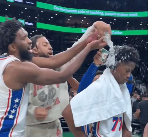 新秀绝杀功臣获全队礼遇 恩比德低迷仍率队浇水庆祝