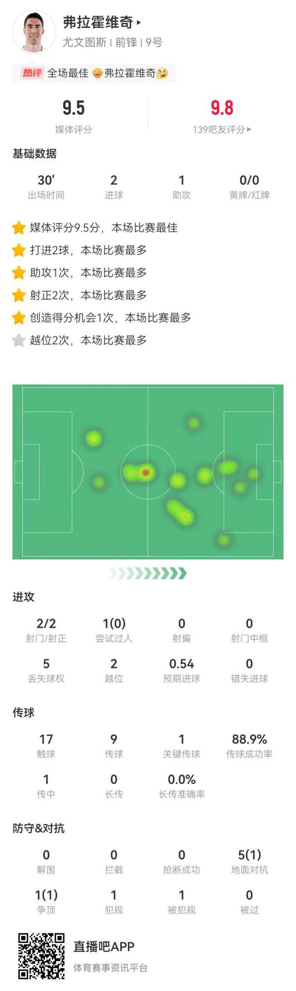 除了直接参与三个进球外,弗拉霍维奇还创造了一次重大得分机会,完成1次关键传球。尽管在17次触球中丢失5次球权,但他在前场的支点作用和终结能力彻底激活了尤文的进攻体系。